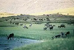The division between the birch and coniferous forests is relatively blurred, with many of the animal species listed above also present in the subalpine zone.[52] Some small mammals are found more frequently here than in the coniferous forests, particularly several rodents such as the common shrew and the field vole. This is also the reindeers' habitat.[53] The Sami people living within the borders of the park, have domesticated the reindeer that stay in this zone during spring and move up to the alpine zone in summer.[53] Brown bears are common in the valleys of Tjoulta and Rapadalen.[54] However, it is the quantity and variety of birds is that enriches this zone.[55] The willow warbler, the common redpoll, the brambling, the yellow wagtail, the northern wheatear and the bluethroat are characteristic of the birch forests.[55] The willow ptarmigan is also more common in this area.[56] The raptors present in the zone are the merlin and the rough-legged buzzard, which often nests on the cliffs.[55] The gyrfalcon and the golden eagle usually prefer lower altitudes, but are nevertheless also found in the park.[57]