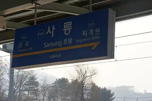 Sareung Station (Korean: 사릉역; Hanja: 思陵驛) is a railway station on the Gyeongchun Line in Jingeon-eup, Namyangju-si, Gyeonggi-do, South Korea. It is named after Sareung, the royal tomb of Queen Jeongsun, the queen consort of Danjong, the sixth king of the Joseon Dynasty.