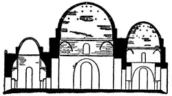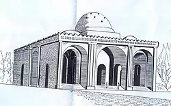 A visitor who would have arrived from the south, would have seen three iwans. After entering the central one, he would have reached a large square hall under a large dome, made of baked brick. After this, a visitor would have found himself on a rectangular courtyard, surrounded by the residential quarters. The building reminds one of the Ghal'eh Dokhtar and the palace of Ardashir, both near Firuzabad; the difference is that the Sarvestan palace is open to all sides. The building, made of stone and mortar, must have had fine decorations, which partly survive.[2]