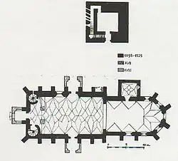 The large structure, built of quarried stone, is a hall church strengthened by 22 high buttresses. The nave is very wide and long, while the choir is closed on three sides. A brick defensive level was built above the choir, while there are two such levels above the sacristy's vaulted ceiling. These floors are accessed through two small brick towers on the western part of the church.[1] The defensive portion is slightly wider than the hall beneath. The nave ceiling, also vaulted, was rebuilt in 1878. The interior decor is mainly Baroque, with only the richly decorated choir pulpit being Gothic. Inscription fragments survive on the exterior walls.[2] Among the church's features are the two arched portals at the north and south sides, the upper windows with their delicate Gothic details, the Baroque altar and its floral decorations made of carved wood, and the 1786 organ.[4]