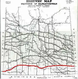 Highway 13 is an east–west provincial highway in the southern part of the Canadian province of Saskatchewan.[2] The highway runs from the Alberta border (continuing westward as Alberta Highway 501) until it transitions into Highway 2 at the Manitoba border east of Antler. It is about 676 kilometres (420 mi) long and passes through the city of Weyburn and the towns of Shaunavon, Assiniboia, Redvers, and Carlyle.