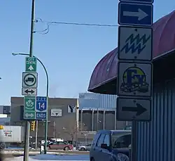 Highway 14 is an east–west provincial highway that runs through the central part of the Canadian province of Saskatchewan.[1] It runs from the Alberta border where it becomes Highway 13 to the intersection of Idylwyld Drive (Highway 11) and 22nd Street in Saskatoon. Previously, Highway 14 ran the width of the province but the section east of Saskatoon was renumbered '16' in 1976. Most of the highway is two-laned with only the 6.7-kilometre (4.2 mi) long section in Saskatoon being four. The total length is approximately 253 kilometres (157 mi) long.