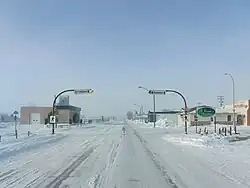 Bienfait,[25] the first community on this section of highway, is about 3 kilometres (1.9 mi) east of Highway 18's junction with 39. The highway continues east from Bienfait and provides access to multiple communities, such as Hirsch, Frobisher,[26] Oxbow,[27] Glen Ewen,[28] Carnduff,[29] Carievale,[30] and Gainsborough;[31] intersects several highways, including 605, 604, 9, 603, 601, 318, 8, and 600; and crosses the rivers of Moose Mountain Creek, Antler River, and Gainsborough Creek. The eastern terminus, at only 2 miles east of Gainsborough, is at the border with Manitoba where it carries on as Manitoba Highway 3.