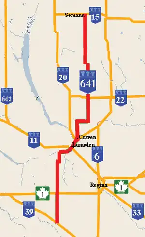 Highway 641 is a 600-series municipal highway in the Canadian province of Saskatchewan. It runs from Highway 39 near Rouleau north to Highway 15 at Semans. It is about 153.3 kilometres (95.3 mi) long. The highway intersects the Trans-Canada Highway south of Pense and east of Belle Plaine, Highway 20 at Lumsden, and Highway 22 at Earl Grey. Local Improvement Districts were the precursors of rural municipalities which initially established and maintained roads in their area. Early settlers helped to construct and maintain the route and would get paid road improvement wages from the local rural municipality. The 8 kilometres (5.0 mi) concurrency between Highway 20 and Highway 641 was constructed in 1927 following the removal of the Canadian National Railway line between Lumsden and Craven. The remainder of the road followed Dominion land survey township and range lines.