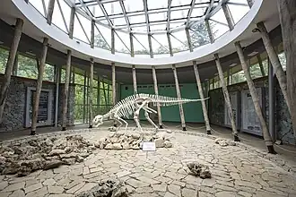 ![]() Fossilized dinosaur footprints presentation in conservation building. | |