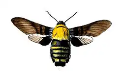 The wingspan is 52–58 mm for males and 58–70 mm for females. It is a mimic of Xylocopa carpenter bees.