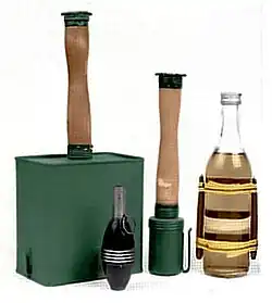 Two improvised satchel charges along with Sidolówka grenades and a Molotov cocktail, as used in the Warsaw Uprising