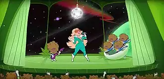 The video opens with a conversation between Rexha and Snoop Dogg in a "groovy" described indoor setting.[27] Responding to her desire to venture into outer space within the "Bebeverse", the rapper guides the singer into an animated cannabis leaf-shaped space ship operated by buds of marijuana.[7][27] He then delivers the directive, "Screw your wig on tight, put your seat belt on, and get ready for the ride of your life, 'cause I'm gonna take you to a whole 'nother dimension."[28] From the moment Snoop Dogg exhales a cloud of smoke, the video undergoes a transformative animation of the entire video.[28] With the onset of the music, Rexha adopts a visual style reminiscent of The Jetsons, lying on a couch with a dog by her side engaging in smoking.[23][24] Subsequently, the video transitions to depict the singer piloting a spaceship through space, arriving at a space station where she encounters Snoop Dogg, joining him on her journey.[23] Following this, it showcases Rexha performing in a concert for aliens, characterised by their unique resemblance to piles of sticky icky.[24] The video ends with her being transported back to her initial setting, lounging on a couch.[23]