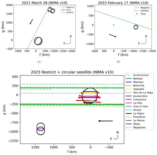 As of 2025, the satellite of Huya has been detected via stellar occultation three times, all by chance as the satellite's orbit was not known at these times.[3] Stellar occultations allow for highly accurate measurements of an object's position, which in turn enables the determination of its orbit. The first occultation detection of Huya's satellite occurred on 28 March 2021. The 2021 occultation by the satellite was detected by Ondřejov Observatory in Czech Republic, which reported an eight-second-long dip (corresponding to a chord length of 73 ± 40 km (45 ± 25 mi)) occurring about 3 minutes before the primary occultation by Huya.[3]: 10 The second occultation by Huya's satellite was observed on 17 February 2023 by Penrose Observatory in Colorado, United States, which reported a nine-second-long dip corresponding to a chord length of 177 ± 35 km (110 ± 22 mi).[3] The third occultation by Huya's satellite was observed on 24 June 2023 by La Palma Observatory in Canary Islands, Spain, which reported an eight-second-long dip corresponding to a chord length of 179 ± 14 km (111.2 ± 8.7 mi).[3] In all cases, the occultation by the satellite was detected at only one location, which prevented the determination of the satellite's shape.[3]