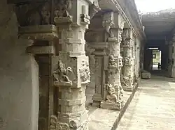 A granite wall surrounds the temple, enclosing all its shrines and bodies of water. The temple has a nine-tiered 135 ft (41 m) gateway tower containing 1,500 stucco images in the outside, while there are 200 murals from the inside. The nine tiers can be climbed through a flight of steps inside the tower. The image of Sathya Vageeswarar in the form of Lingam is housed in the sanctum. The shrine of his consort is housed in a west facing shrine. The sanctum is approached from the gateway through a flag staff hall, a Mahamandap and an Artha mandap. There are shrines of Vinayaka and Subramanya on the Mahamandap. The first precinct around the sanctum has images of Dakshinamurthy, Vishnu, Durga, Chandikeswara and Navagrahas. The flagstaff hall has a flagstaff, an altar and an image of Nandi, all axial to the sanctum and the gateway tower. There are also halls in the temple having yali pillared halls, atypical of Nayak art. The temple also has a granary made of masonry, which is believed to be commissioned during the 13th century. It is unique that usually temple granaries are made of wood.[5]
