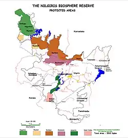 Map of Nilgiris Biosphere Reserve, showing Sathyamangalam Wildlife Sanctuary