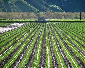 Land use in the vicinity of the field is predominantly agricultural, with oil wells and associated production infrastructure interspersed between working agricultural fields and orchards. Climate in the region is Mediterranean, with cool, rainy winters and warm, rainless summers, in which the heat is moderated by frequent morning coastal low clouds and fog. Annual precipitation is around 15 inches, almost all in the winter, and all in the form of rain. The mean annual temperature is 56 °F (13 °C) to 60 °F (16 °C); freezes occur rarely.[3] Elevations on the field range from about 140 to 220 feet (43 to 67 m) above sea level. As it is in the Santa Clara River floodplain it is mostly flat, with runoff going directly into the adjacent Santa Clara River which flows west toward its outlet into the Pacific Ocean between Oxnard and Ventura.