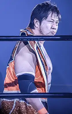 Satoshi Kojima (小島 聡, Kojima Satoshi; born September 14, 1970) is a Japanese professional wrestler.[1] He is signed to both New Japan Pro-Wrestling and Major League Wrestling (MLW), where he is a former two-time MLW World Heavyweight Champion and former one half of the MLW World Tag Team Champions in his second reign. He also makes appearances for All Japan Pro Wrestling (AJPW). Considered to be one of the greatest Japanese professional wrestlers of the 21st century and of all-time, he was the first wrestler to hold NJPW's IWGP Heavyweight Championship and AJPW's Triple Crown Championship simultaneously, the fourth to win the three major heavyweight championships in Japan with the Triple Crown Heavyweight, IWGP Heavyweight, and Noah's GHC Heavyweight Championship, and one of three wrestlers to hold the IWGP Heavyweight Championship, Triple Crown Championship, and NWA Worlds Heavyweight Championship (the other two being Keiji Mutoh and Shinya Hashimoto), and is an overall eight-time world champion in major professional wrestling promotions.
