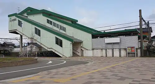 The station consists of two ground-level opposed side platforms serving two tracks, with the station situated above the tracks.