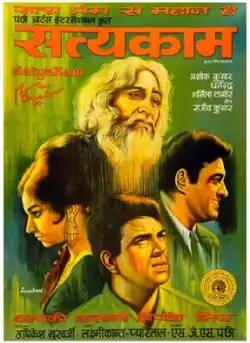 Satyakam is a 1969 Indian drama film directed by Hrishikesh Mukherjee, based on a Bengali novel of the same name by Narayan Sanyal.[1] The film stars Dharmendra, Sharmila Tagore, Sanjeev Kumar, and Ashok Kumar.[2] The film was scored by Laxmikant Pyarelal. The name of the film is inspired by ancient Hindu saint Satyakama Jabala.[3]