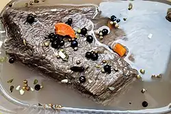 Red wine vinegar and wine typically form the basis of the marinade, which also includes earthy aromatic spices such as peppercorns, juniper berries, cloves, nutmeg, and bay leaves and less commonly coriander, mustard seed, cinnamon, mace, ginger, and thyme.[3][15][16] The marinade may also include vegetables such as onions, celery, and carrots.[13] The acidic marinade helps tenderize the meat before it cooks. Buttermilk is also used as a marinade in certain regional varieties.[5][17] It is frequently advised to marinate the meat in an earthenware, glass, plastic, or enamel container rather than one made of bare metal, as the acidic marinade would react with a metal vessel during the extended marinating.