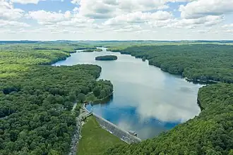 The Saugatuck Reservoir is a reservoir in Fairfield County, Connecticut, United States, that straddles the border between the towns of Redding, Weston, and Easton.[2] Its completion is marked by the creation of the Samuel P. Senior dam[3] of the Saugatuck River in January 1942,[4] and provides water to several of the nearby towns. The reservoir is surrounded by the Centennial Watershed State Forest[5] and a small section of the Trout Brook Valley State Park Reserve on the southeast end of the reservoir. The Saugatuck Reservoir utilizes an uncontrolled spillway adjacent to the Samuel P. Senior dam that effectively limits the maximum water level. There is also a concrete levee positioned on the southeastern side of the reservoir that prevents water from flooding Trout Brook Valley.