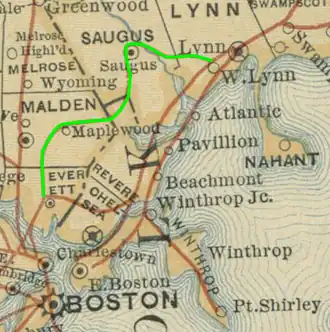 ![]() 1887 map with Saugus Branch highlighted in green | |||