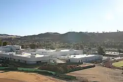 Saugus High School is located just north of the geographic center of Santa Clarita. The school's campus is built on a hill, with a leveled upper and lower campus and a sloped quad in between the two campuses. The A, B, C, D, E, F, and G buildings are located on the lower campus. Generally speaking, elective classes are located on the lower campus. The theater arts, choir, and band classes are housed in building E. The ASB and student store are housed in the A building, art and ceramics classes in the B building, and computer and business classes in the C building. Video, wood, auto shop, and other elective classes are in the D building. Some core classes are scattered throughout the lower campus nonetheless. The campus is bounded on the east by Centurion Way, on the south by Bouquet Creek, and on the west by the Los Angeles Aqueduct.