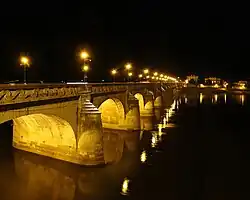 In 1944 it was the target of the first Tallboy and the fourth Azon bombing raids by Allied planes. On 8/9 June 1944,[5] 5,400 kg (12,000 lb) Tallboy "earthquake" bombs were first used, against a railway tunnel near Saumur. The hastily organized night raid was to stop a planned German Panzer Division, travelling to engage the newly landed allied forces in Normandy. The panzers were expected to use the railway to cross the Loire. No. 83 Squadron RAF illuminated the area with flares from four Avro Lancasters and marked the target at low level by three de Havilland Mosquitos. 25 Lancasters of No. 617 Squadron RAF, the "Dambusters" then dropped their Tallboys from 5,500 m (18,000 ft) with great accuracy. They hit the approaches to the bridge, blocked the railway cutting and one pierced the roof of the tunnel, bringing down a huge quantity of rock and soil which blocked the tunnel, badly delaying the German reinforcements moving towards Normandy, especially 2nd SS Panzer Division Das Reich.[6][7] The damaged tunnel was quickly dug out to make a deeper cutting, resulting in the need for a second attack.