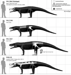 Saurosuchus is known from numerous specimens coming from the Ischigualasto Formation. Apart from the holotype, another individual was identified: Specimen PVL 2198, consisting of a partial maxilla, left ilium, right and left ischium, 11 dorsal vertebrae, osteoderms, ribs, and teeth.[1] Sill referred additional specimens, PVL 2557, 2472 and 2267. The specimen PVL 2557 consists of two dorsal vertebrae, right and left sacrals, nine caudal vertebrae, right ilium, ischium and partial pubis, right femur, tibia, fibula, tarsus and pes, ribs, and chevrons. PVL 2472 compromises one cervical vertebra, tibia and astragalus. Lastly, PVL 2267 is composed by a fragmented ilium, femur, tibia, fibula, tarsus, and partial pes.[2] In 2010, during the redescription of the skull of Saurosuchus, Alcober referred and described the immature specimen PVSJ 32, consisting of a complete skull, complete cervical and dorsal vertebral series, four anterior caudal vertebrae, ribs, and two dorsal osteoderm rows.[3] The postcranial remains of this specimen, were properly described by Trotteyn et al. 2011.[4]