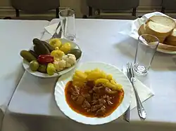 The Savanyúság (ˈʃɒvɒɲuːʃaːɡ) are small side dishes of vegetables or fruits pickled in brine in the Hungarian cuisine, commonly accompanying the main dish. When it is cut up to small pieces, it is called csalamádé.[1] It's often made of watermelon,[2] almapaprika (Capsicum annuum L. convar. Longum), bell pepper, cucumber, leeks, red cabbage, cauliflower, carrot, green tomatoes, sauerkraut (savanyú káposzta), beetroot,[3] TV pepper (abbreviation of "töltésre való", meaning "meant for stuffing"; e.g. making töltött paprika, but jam is also made out of it[4]), mostly soaked in vinegar.