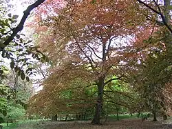 At the Three Oak Hill Drive crossroads, a track north-east points to Birch Copse (grid reference SU239662). Duke's Vaunt Oak (grid reference SU238664) is a notable tree approximately 1,000 years old. It was once hollow and 30 feet (9.1 m) in girth. In 1760 it had a door and a lock and was capable of sheltering "twenty boys".[19][Note 2] The tree is badly split now, but survives. Here the ground is damp and parts of Birch Copse barely see daylight. While some of the tall pines seem senescent, other plantation firs are green and vibrant. Many varieties of fungi can be seen in profusion in October, but dead-wood fungi are common enough throughout the year. At the southeast edge of the forest are good examples of Sweet Chestnut and Yew. At Holt Pound (grid reference SU248657) an avenue of oaks joins Birch Copse to Bedwyn Common (grid reference SU255652). This section of Savernake has its own avenue, London Ride, which at 1+1⁄3 miles (2.1 km) runs from St Katherine's Church (grid reference SU252649) to Upper Horsehall Hill Farm (grid reference SU261667). The ride is lined with oak in the south, and by limes in the north. Many old oaks and old sweet chestnuts are still standing, and foxgloves populate the forest edges. Forest tracks and bridleways lead southeast, and this is very much assarted[Note 3] countryside. When Stock Common (grid reference SU262644) is reached there are footpaths to Shawgrove Copse (grid reference SU270643), within sight of Great Bedwyn, or south to the rear of Tottenham Park by way of Bloxham Lodge (grid reference SU262637).