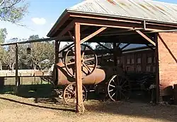 A fair proportion of these objects are original to specific sites and are located in situ - for example, the 1948 Ronaldson and Tippet power generating plant in the homestead powerhouse; the c 1912 grindstone at the woolshed; four old bu presentable Peugeots in a shed near the Homestead and the 1926 petrol pump also near the homestead (under a shelter), identified as a LASCO Larkins Aircraft Supply, understood to be the only working original example in Australia.. Other objects are located at sites with which they are primarily associated e.g. the Clayton and Shuttleworth steam engine no 27258 used to provide power to the woolshed from 1912 to 1938 and the c.1860s grindstone moved from Mulwala Station woolshed.[1][4]