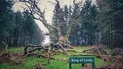 In the past standardisation was not at all essential. Craft work and early mechanical industry, such as shipbuilding, wagon making, and furniture making all required "bends" and "knees," as well as other eccentrically shaped pieces which the side branches would provide. Trees such as beech and oak can be pollarded, a process whereby a standard is cut two-thirds up its trunk. Multiple boughs grow from the cut point and the life of the tree is extended and curved pieces of bough or trunk are often produced. Such trees become magnificent specimens and they live through generations of forest workers. Their base trunk attains great girth. Often the side boughs become too heavy and are broken in stormy weather. In other cases the bough weight (an outward force) begins to tear the lower trunk apart creating a cavity which can over decades become cavernous in size. The oldest of these pollarded trees is the Big Belly Oak beside the A346 road. Big Belly is one of Fifty Great British Trees named and honoured as part of the Queen's Golden Jubilee celebrations. It has a girth of 11 metres (36 ft) and is 1000–1100 years old. In 2001 it was in danger of splitting in two, a fate that had already overtaken the similarly aged Duke's Vaunt. To prevent this, the tree was fitted with a metal corset.[13] The 2011 Radiohead album The King of Limbs is named after the ancient King of Limbs tree in the forest near Tottenham House, where the band recorded part of their previous album, In Rainbows.[14][15]