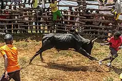 Fighting zebu raised for savika are fed supplementary diets of cassava and yam twice a day.[16] Zebu are chosen based on appearance, pedigree, and apparent fierceness and strength. Good savika zebu generally have large humps, developed horns, and lean, muscular bodies, are between 3 and 4 years old, and weigh between 300 and 400 kg. The most desirable zebu are either reddish-black with grey ears, or sport a tricolor (red, black, and white) coat. Buyers test the aggression of zebus at market by poking them with sticks, and aggressive zebu fetch much higher prices than docile cattle, especially when fighters are present at market.[17][18] Zebu aggression is described according to a system of classification (e.g. magnapika zebu, who "gore from bottom to top").[17] Once a zebu is purchased, an ombiasa (healer) performs rituals to render the ox invincible, and feeds it a strengthening potion whose formula is kept secret to prevent the production of an antidote.[18] Docile zebu who are otherwise good candidates for savika may be given stimulants before entering the arena.[17]