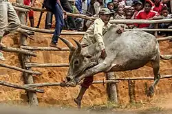 The coordinator introduces the event, delivering a kabary (oration) explaining the tradition and blessing the zebus and fighters. Savika ceremonies are ubiquitously preceded by a "prayer of invocation of Zanahary [the supreme deity of Malagasy religion], the ancestors, and the holy land."[26] The fighters' representatives recite a vow of fair conduct. The zebus' owners recite their own kabary introducing the animals. Barefoot and armed with sticks, fighters take turns wrestling the ox.[27] During the event, women sing a theme song containing directives for the fighters, accompanied by piercing screams. Women also throw cold water into the arena throughout the fight, which enrages the animal and refreshes the man.[28] The fighter attempts to defeat the animal by either encircling its hump, choking its neck, or grasping its head. Victory over the zebu is proclaimed when the animal lies on the ground, or if the final blow is "unequivocal".[29] The zebu is sometimes sacrificed, sometimes returned to its owner, and sometimes gifted to the champion.[30] Fighters may receive monetary rewards from spectators for being the first to fight the ox,[31] but such rewards are generally uncommon, as savika is considered a social institution whose innate rewards are spiritual and communal.[25]