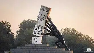 Saving Iraqi culture (Arabic: نصب انقاذ الثقافة, romanized: Nasb Enqath al-Thaqafa) is a monument located in the Mansour district of Baghdad. It was commissioned in 2010 by the Mayor of Baghdad and designed by Iraqi sculptor Mohammed Ghani Hikmat.[1] The monument shows a broken cylinder seal, with hands and arms attempting to support it so as not to fall.[1] The cuneiform on the seal reads writing began here.[1]