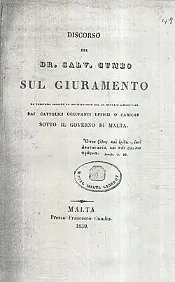 - 1839 - Sul Giuramento (On the Pledge).[1]: Vol.I pp.204–205 This 19-page booklet in Italian published in Malta (by Francesco Cumbo), reproduces a speech which Cumbo gave in 1838 to civil servants. The central part of the address deals with the problem encountered by Catholic workers who solemnly pledged their loyalty to a Protestant government (since at the time Malta was under British colonial rule). Though the local authorities of the Catholic Church had declared immoral such a pledge, Cumbo ventures to state in clear terms that it is not so. This irked the local bishop, who accused Cumbo of heresy before the Holy See in Rome. In response, Cumbo wrote Il Trenta Gennajo (below).
