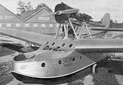 The earlier S.55 carried its empennage on a pair of open, flat, triangular girders constructed from tubes, one from each hull. The S.63 used a similar arrangement, allowing its single, unusually wide hull to be short. Its bottom had a shallow, concave V-section and a single step. Lateral stability on the water was provided by outward-leaning, V-bottomed floats mounted a little outside the centre-section. The original bomber version had defensive ring-mounted machine gun positions in the nose and behind the trailing edge. A forward entrance led to the pilots' side-by-side open cockpit, offset to the left and ahead of the wing leading edge.[1] The airliner conversion separated the pilots into two symmetrically positioned, enclosed cockpits[3] and introduced a windowed 3 m × 3 m (9 ft 10 in × 9 ft 10 in) passenger cabin behind the cockpit which seated ten. Behind it there was a space for luggage and a wireless operator's compartment with access to the engines.[1]