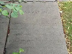 The plot contains 32 vaults, all with flat stone roofs, with family members being interred together.[3] Each is numbered in Roman numerals with one un-numbered vault.[1] The dates of death range from 1722 to 1854 and include 236 individuals of whom 11 were aged under one year and 26 under five.[1] Among them are: