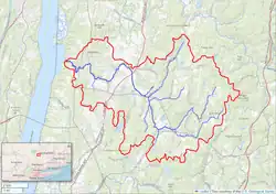 The Saw Kill watershed covers 22 square miles (57 km2),[1] with the stream and its tributaries totalling 54.8 miles (88.2 km).[24] It includes more of the town of Red Hook than any of its other watersheds, stretching from its mouth west to expand enough to include almost all of the village and most of the town west of it. In Milan, the watershed covers a roughly semicircular area of the eastern half of town. The Rhinebeck portion, the smallest of any of the three towns in the watershed, includes the areas around Sepasco Lake and a large swampy area near the Old Rhinebeck Aerodrome from which an unnamed tributary arises.[25]