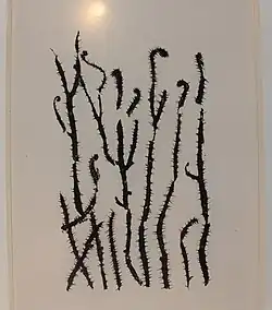 Sawdonia is an extinct genus of early vascular plants, known from the Upper Silurian to the Lower Carboniferous (430 to 320 million years ago). Sawdonia is best recognized by the large number of spikes (enations) covering the plant. These are vascular plants that do not have vascular systems in their enations. The first species of this genus (Sawdonia ornata) was described in 1859 by Sir J. William Dawson and, was originally attributed to the genus Psilophyton. He named this plant Psilophyton princeps. In 1971 Francis Hueber proposed a new genus for this species due to its "Divergent technical characters from the generic description for Psilophyton."[1] The holotype used for description is Dawson Collection Number 48, pro parte, Museum Specimen Number 3243. (See Dawson 1871, Plate IX, fig 101.) Sir J. William Dawson Collection, Peter Redpath Museum, McGill University, Montreal, Quebec, Canada.[1]