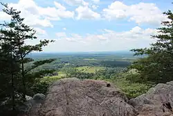 It is believed that Native Americans may have used a natural clearing atop the mountain called the Indian Seats for ceremonial purposes.[5] As white settlers migrated to the area, now known as Cumming, a local Cherokee named Sawnee helped them adjust to the native land. As a well skilled carpenter and farmer he was known throughout the land. He was later driven away from their native lands by these white settlers and died while traveling on the Trail of Tears. The range was named in his honor. In 1829 gold was discovered in Georgia in Auraria at the site of America's first gold rush. There are also mines in the ridges of Sawnee which is downstream the Chattahoochee from the major strike.[6] Current uses of the mountain are as a nature preserve park and a Radio station, WWEV-FM 91.5, which transmits from a radio tower at the top of the mountain. Originally, the station staff actually drove recorded programming to the top where it played from broadcast automation equipment, but it now uses a live studio/transmitter link.[7] The Sawnee Mountain Visitor Center is located at 4075 Spot Road and is one of the trailheads.