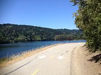 The Spring Valley Water Company purchased 2,200 acres (890 ha) named the "Sawyer Tract" by 1876.[3] After the construction of Crystal Springs Dam, which formed the Lower Crystal Springs Reservoir, the inn and much of the old road was flooded by 1888. A narrow, winding gravel access road was built along the present-day route of Sawyer Camp Trail. When the city of San Francisco took over the watershed lands, Sawyer Camp Trail was then a county road. The Water Department fenced it for the protection of San Francisco's drinking water. The mostly gravel road was open for vehicular traffic from dawn to dusk, until 1978.