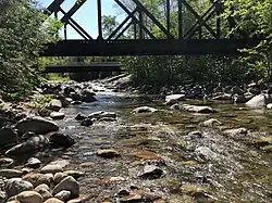 ![]() The Sawyer River near its mouth. Former Mountain Division railroad bridge in front; U.S. Route 302 bridge in back. | |