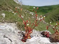 Rue-leaved saxifrage is a winter-annual herb with distinctive, trilobed, fleshy leaves and red stems. These stems, the leaves and the sepals are covered in numerous sticky glands. In Great Britain, it is associated with dry, open habitats including sand dune grassland, sandy banks and verges, solution hollows on limestone pavement and rock ledges, cliffs and screes, and old sand- and gravel-pits. It is also often found in urban environments on mortared walls, pavements, churchyards, car parks and railway tracks. It is most commonly found on base-rich substrates, often on skeletal soils or virtually bare rock.[2]