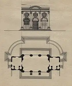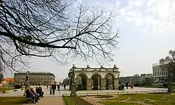 - The Great Salon, situated on the axis in the center of a Saxon Garden, was intended simply to provide a suitable end to the main garden axis. It was constructed after 1720 according to Matthäus Daniel Pöppelmann's design.[4] The building was opened to the garden by semicircular porte-fenêtres and oculi. A terrace above the ground level of the building was enclosed by an attic decorated with vases; also, two outhouses from both sides were added. The Great Salon was demolished in 1817.[6]