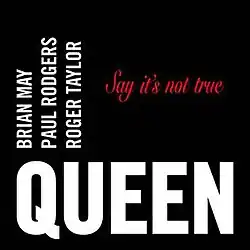 "Say It's Not True" is a song by Queen + Paul Rodgers, released on World AIDS Day, 1 December 2007 as the lead single from the supergroup's sole album, The Cosmos Rocks. The song was written by drummer Roger Taylor and features all three members on vocals. It was available as a free download from QueenOnline.com. The song was performed live on the Queen + Paul Rodgers 2005/06 world tour, however the live rendition was acoustic and only featured Taylor on vocals. When played on the Rock the Cosmos Tour, the song was sung by Taylor, May and Rodgers as on the single.
