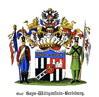 Sayn-Wittgenstein-Karlsburg was a cadet branch of Sayn-Wittgenstein-Berleburg, created by in 1694 Graf Casimir (ruled 1693–1741) for his younger brother Count Karl Wilhelm (1694–1749).[1] In 1806, the county was mediatised by the Grand Duchy of Hesse, while in 1816, it became annexed by Prussia. This cadet line of Sayn-Wittgenstein became extinct with the death of Count Christian Ludwig Karl zu Sayn-Wittgenstein-Karlsburg (1786-1867).