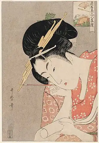 Bijin and courtesan. Hanaogi was of 'yobidashi' rank in the brothel of Ogiya Uemon (扇屋宇右衛門) in Edo-cho 1-chome. She was the most renowned courtesan of the Kansei era. Impressions are known with 'bijin' in the title but these all have just the name 'Hana … of the Ogiya', without the second 'ogi' character of the courtesan's name and without the names of her 'kamuro', which have been carved out of the block. As Suzuki Juzo has pointed out, this probably has something to do with the incident of 1794 in which Hanaogi ran away from the Quarter, only to be brought back a short while later. After this incident, it can be surmised that the block was altered in this way so as to avoid infringement of the law forbidding the treatment of contemporary events.