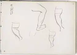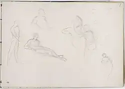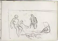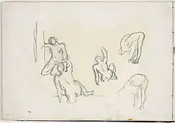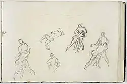 The work is the result of long and arduous planning by Bazille, as demonstrated by the numerous sketches and drawings that depict Bazille's original plans for the painting. In addition to the many rough sketches, Bazille created his only known drawing of an entire composition. Rather than the eight figures depicted in Scène d'été, the compositional drawing consists only of seven, with four of them—the young man reclining, the figure in the front-left, and the two wrestlers in the background—placed in the same location as in the final painting.[5] Additionally, the wrestling figures in the center of the canvas are locked together more rigorously in the painting than in the drawing, while the boy in the water below is more-or-less floating with his head briefly turned to the left, unlike in the drawing, where the boy adopts a more natural swimming pose.[6] The sketches found in Bazille's sketchbook depict variations of the figures found in the drawing and final painting, demonstrating how Bazille meticulously planned the poses of each figure. The two wrestling figures are drawn multiple times in various interlocking grips, and another of these sketches shows a seated figure with his back turned to the spectator, likely revealing another figure Bazille refrained from including in the final work.[5]