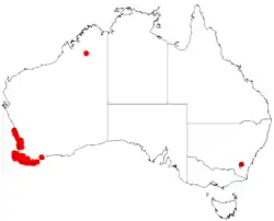 It is found in the IBRA Regions of the Esperance Plains, the Geraldton Sandplains, the Jarrah Forest region, the Swan Coastal Plain, and the Warren biogeographic region, growing on white or grey sand and clay, in coastal limestone cliffs and dunes.[4]