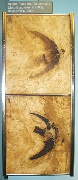 - ^ a b c d e f g h Mayr, G. (2015). "Skeletal morphology of the middle Eocene swift Scaniacypselus and the evolutionary history of true swifts (Apodidae)". J Ornithol. 156 (2): 441–450. Bibcode:2015JOrni.156..441M. doi:10.1007/s10336-014-1142-9. S2CID 14282557.