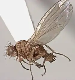 Scaptomyza flava is an herbivorous leaf mining fly species in the family Drosophilidae. In Latin, flava means golden or yellow.[1] The fly is amber to dark brown in color and approximately 2.5 mm in length.[2][3] In Europe and New Zealand[4][5][6] the larvae are pests of plants in the order Brassicales, including arugula, brassicas, broccoli, Brussels sprouts, bok choy, cabbage, canola, cauliflower, horseradish, kale, kohlrabi, napa cabbage, nasturtium, radish, rapini, rutabaga, turnip, wasabi and watercress.[4] In New Zealand, its range has expanded to include host species that are intercropped with salad brassicas, including gypsophila, otherwise known as baby's breath, which is in the pink family (Caryophyllaceae) and the pea (Pisum sativum) in the Fabaceae.[6] More typically, S. flava is oligophagous within the Brassicales. Scaptomyza are unusual within the Drospophilidae because the group includes species that are truly herbivorous.[7][8][6] Other herbivorous drosophilids include D. suzukii, which attacks fruit very early during ripening[9] (and so is a frugivore) and species within the genus Lordiphosa, from Africa and Asia, which also include leaf miners.[10] Most drosophilids feed on microbes associated with decaying vegetation and sap fluxes.[11]