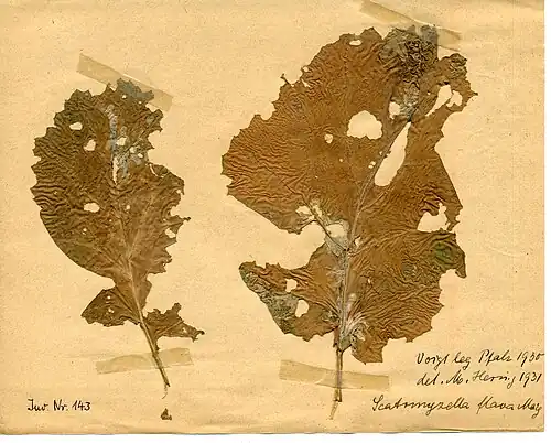 Scaptomyza flava belongs to the order Diptera, the family Drosophilidae, and the genus Scaptomyza along with around 272 other species.[13] Scaptomyza is a monophyletic genus nested within the paraphyletic Drosophila lineage that includes D. mojavensis, D. virliis and D. grimshawi.[14] The genus Scaptomyza is sister to or paraphyletic with respect to the Hawaiian Drosophila radiation.[15][16][17][18] Scaptomyza flava is a member of the subgenus Scaptomyza, which is the only subgenus in the Scaptomyza known to include obligate leaf mining species.[7] However, S. flavella, in the subgenus Bunostoma, is a facultative leaf miner of New Zealand sea celery, but adult females oviposit in decaying leaves and so living leaves are attacked by larvae that move in from decaying leaves.[19]